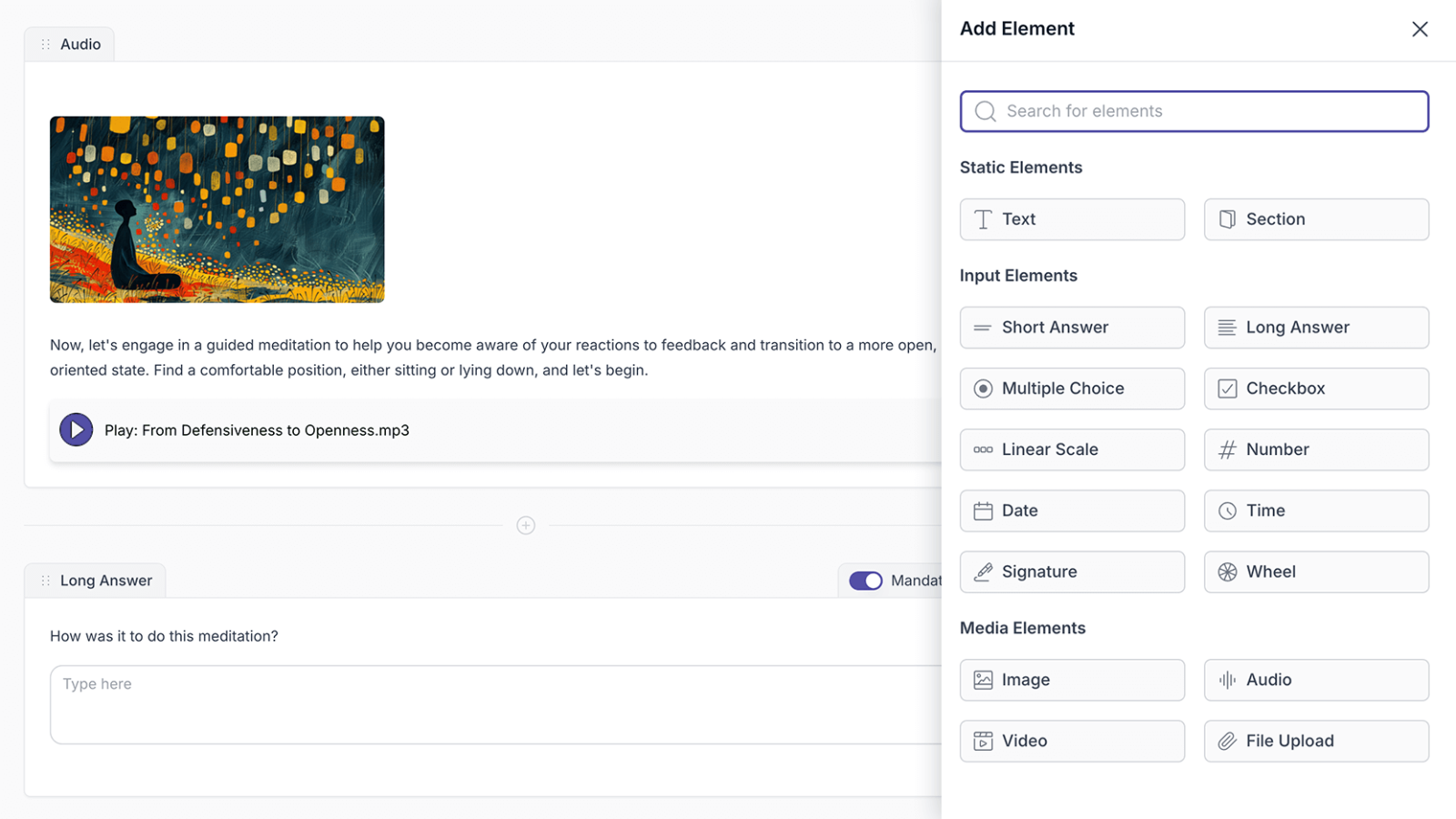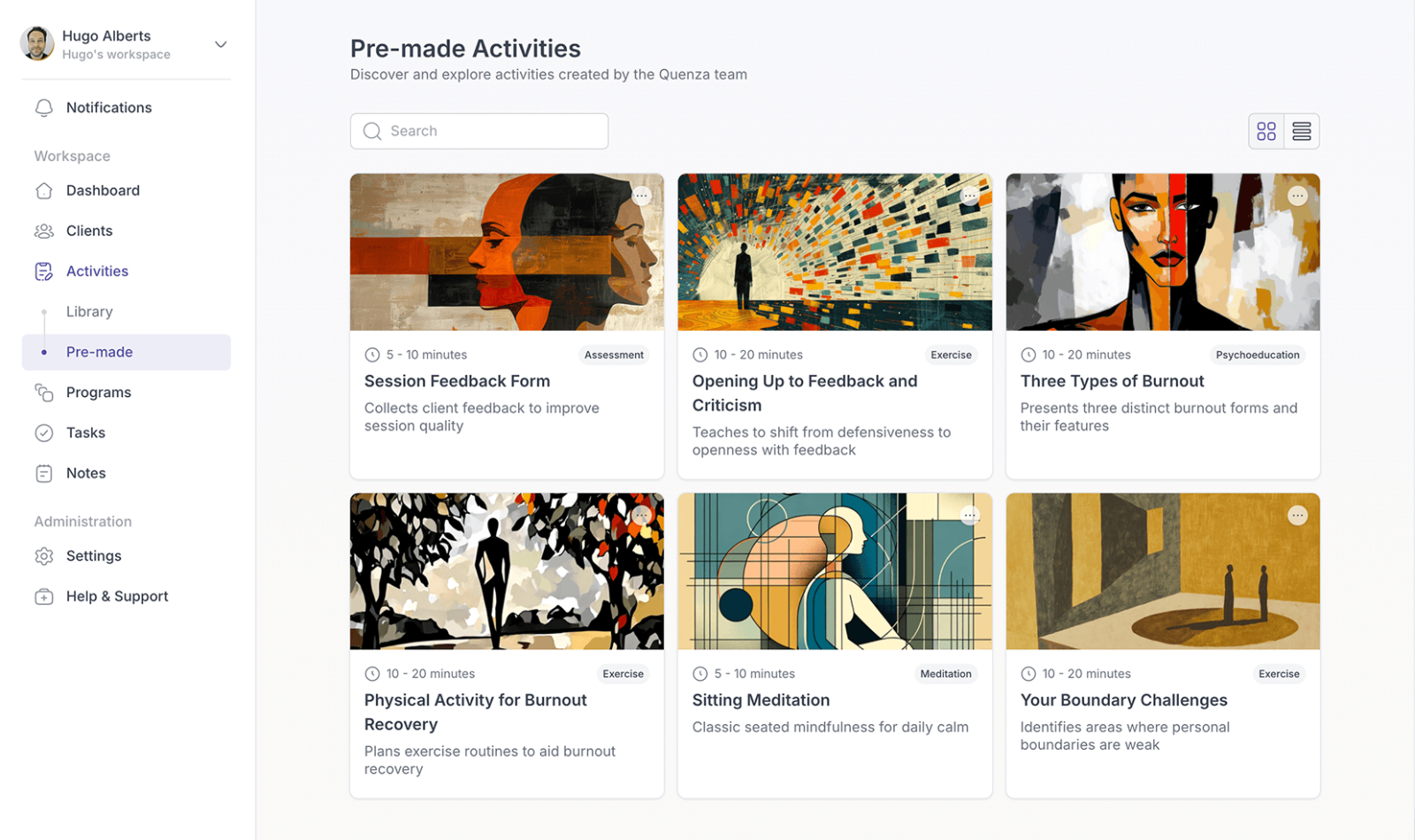 From mindfulness exercises and stress assessments to psychoeducational lessons, Quenza gives you the tools to deliver powerful, structured experiences between sessions. Choose from a growing library of science-based activities or build your own with our intuitive drag-and-drop builder.
