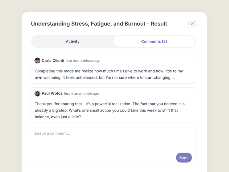 Both clients and professionals can comment directly on completed activities—making each one a space for ongoing dialogue, clarification, and encouragement. It’s like having a session thread that evolves with the client’s journey.