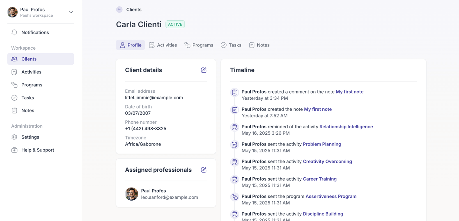 Each client profile gives you a complete, real-time timeline—so you can easily see their latest activities, shared notes, assigned tasks, and ongoing programs at a glance.