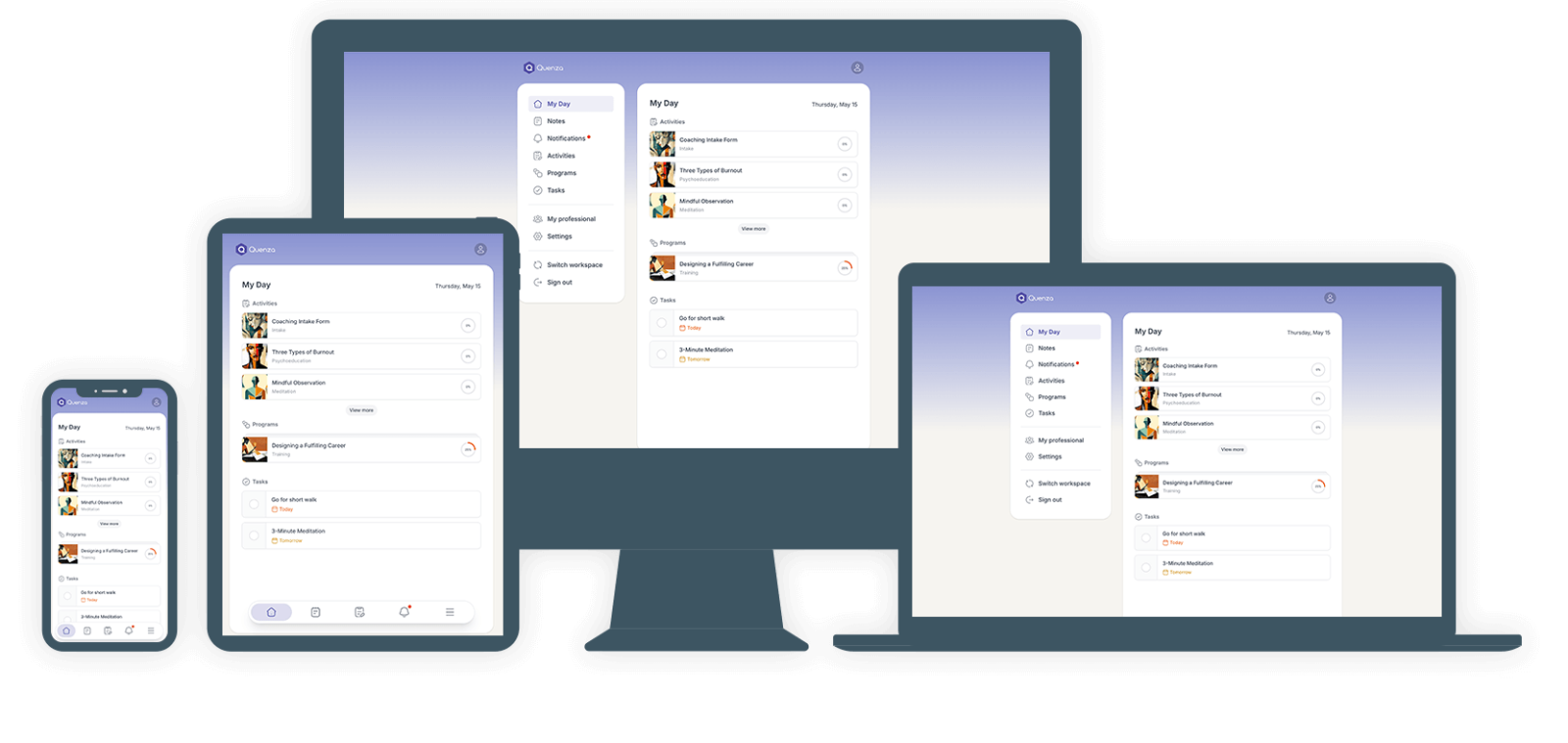 With the Quenza Client App, your clients aren’t just passive participants — they’re engaged contributors to their own growth. The intuitive app gives them the tools they need to stay organized, reflect, and stay on track between sessions: