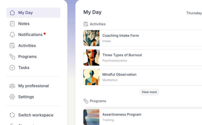 Clients can see their personalized home page (“My Day”), all activities, programs, and tasks, plus any shared notes or comments. It’s their central hub for working with you.