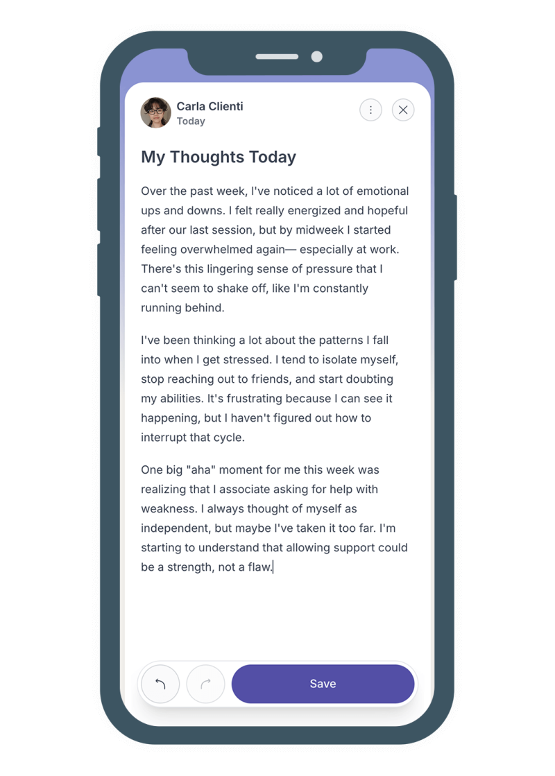 Clients can easily jot down thoughts, reflections, or session takeaways — and choose to share them directly with you.