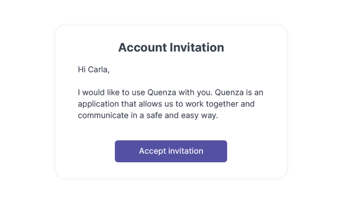 If you have not already received an invitation from your professional to setup you personal Quenza account, the first step is to ask your professional to invite you to Quenza. You will receive an email with a button that will lead to a page where you can setup your own account.