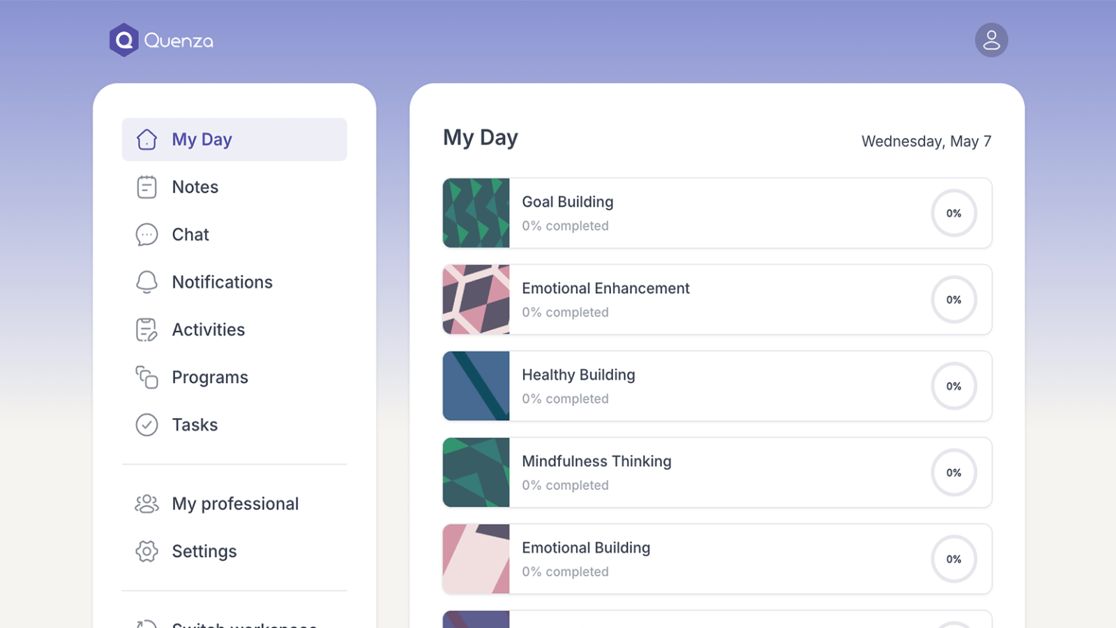 Quenza is a simple online tool that makes working with your practitioner easier and more effective. Think of it as your personal space to stay connected with your practitioner, complete activities, and track your progress - all in one secure place.